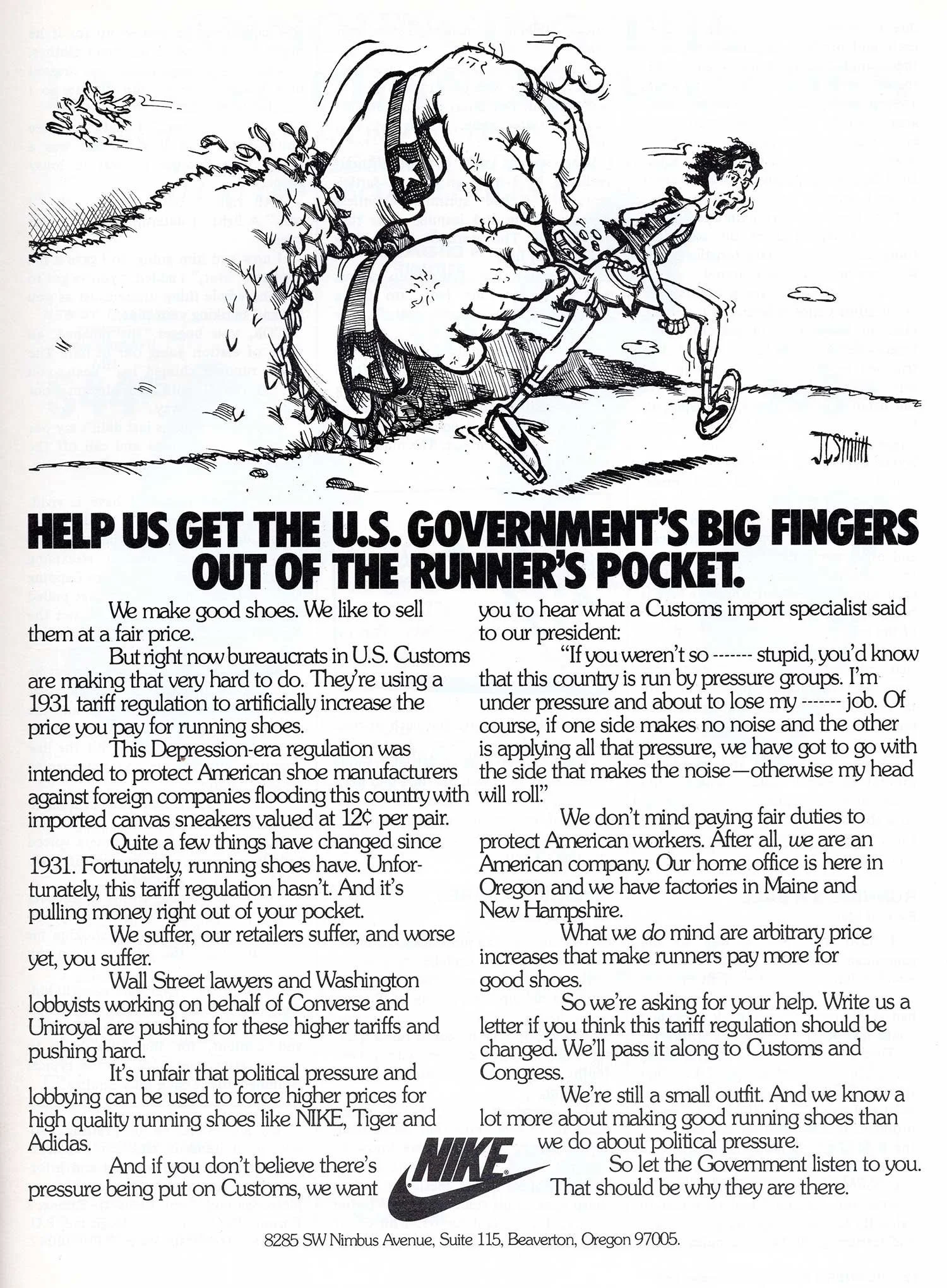 “Get the government’s big fingers out of the runner’s pocket,” Nike said.